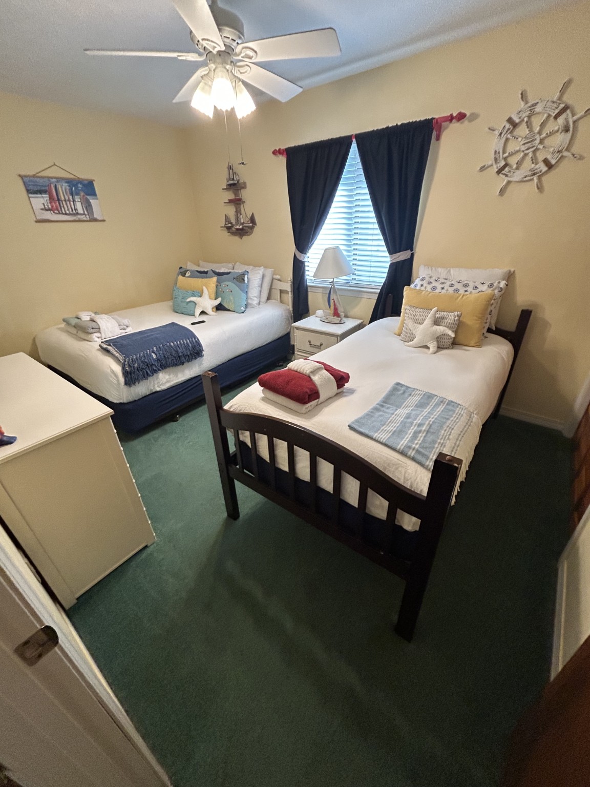 The second bedroom offers a cozy queen bed and an XL twin bed, plus a flat-screen TV with an Amazon Fire Stick. -